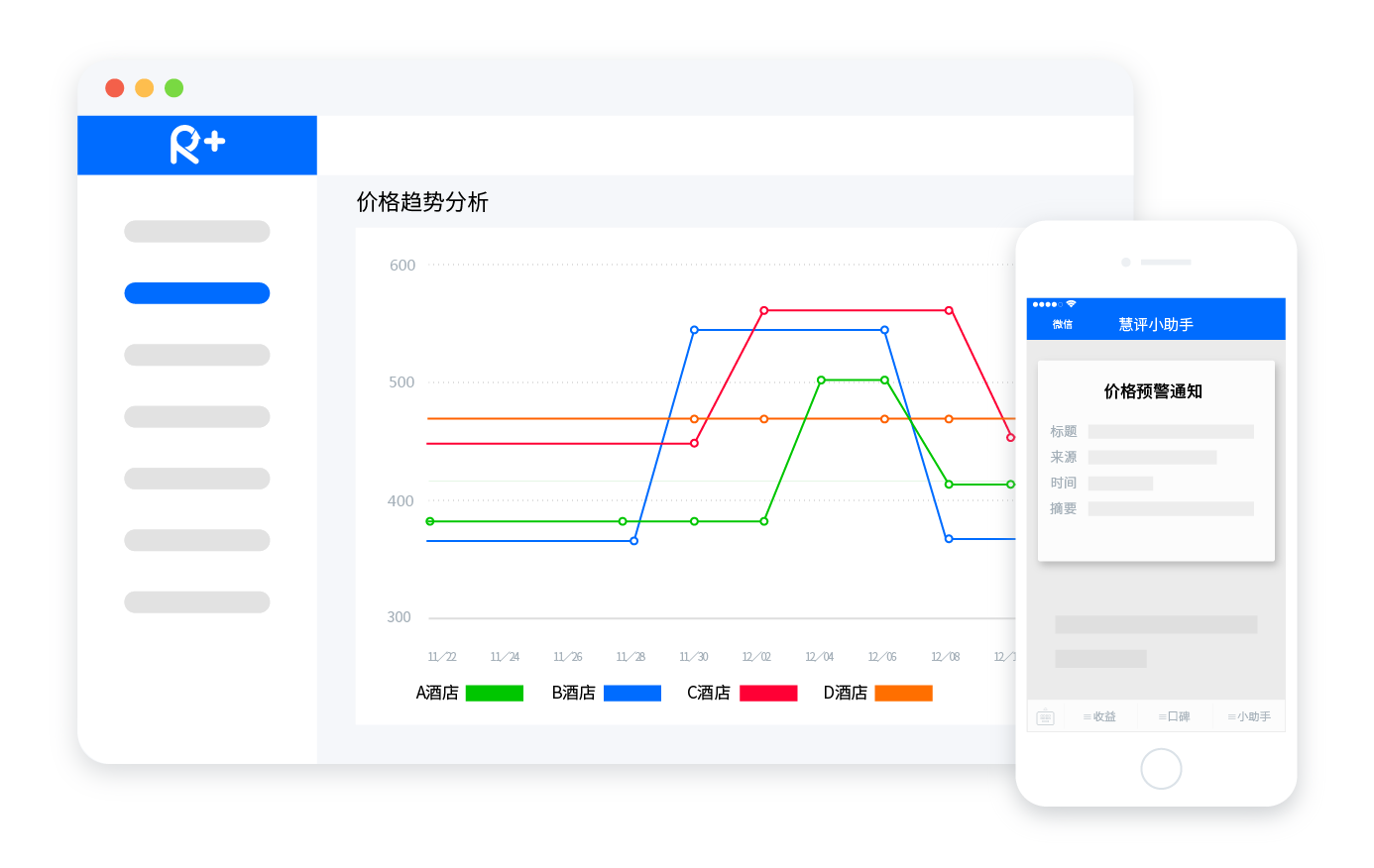 可按照不同支付类型、入住天数,监控本酒店与竞争对手,未来28天的各渠道价格,微信获取价格变动和房型紧张预警;
